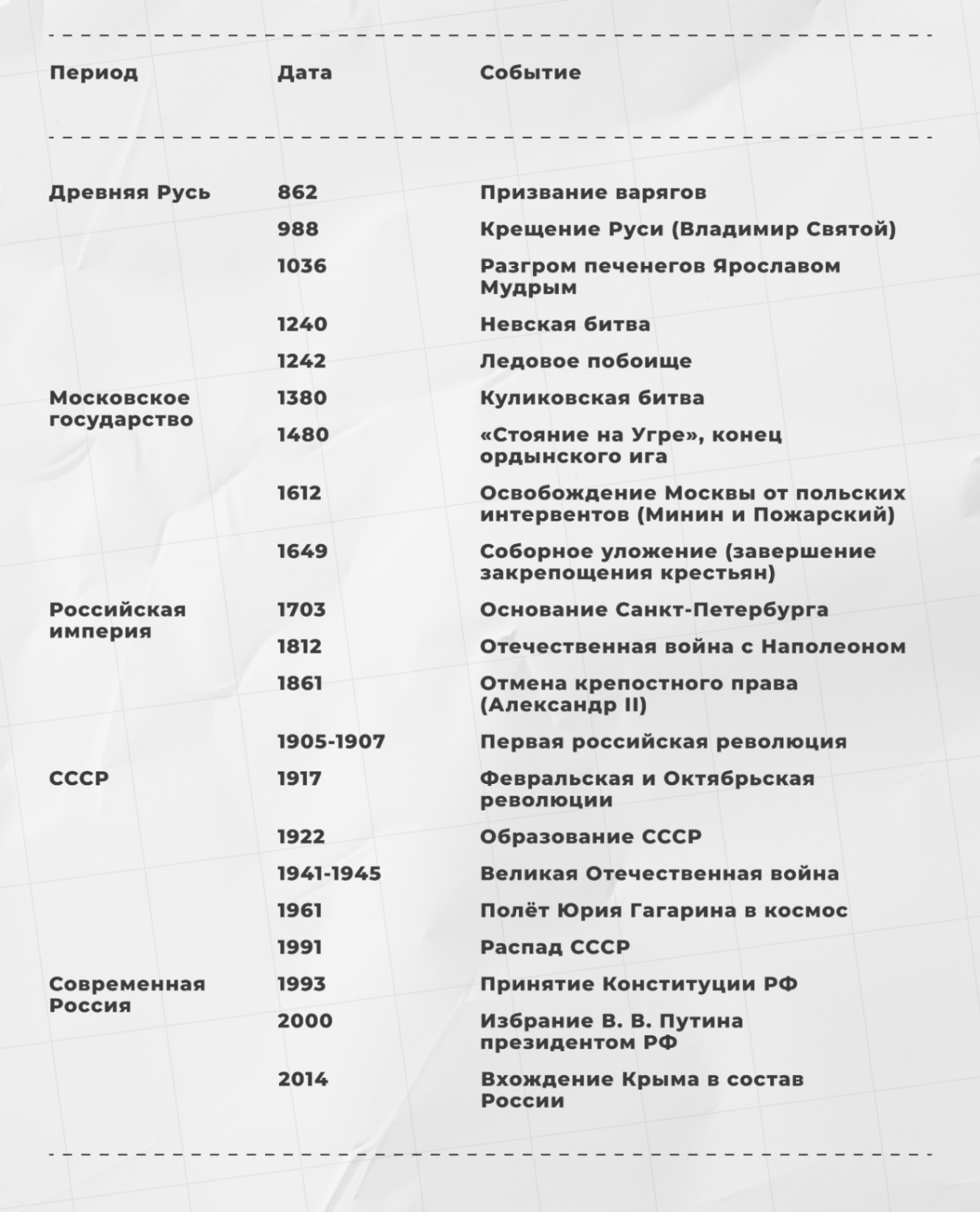 - Делите даты на блоки (Древняя Русь, Средневековье, Новое время, ХХ век).