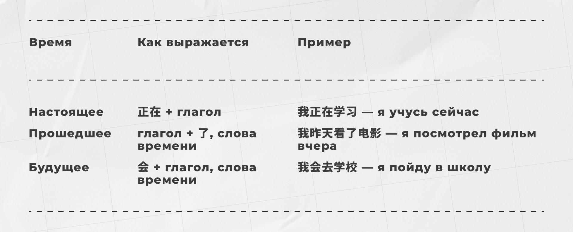 Эта простая таблица времён в китайском языке помогает быстро закрепить правила.