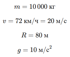 Грузовик массой 10 т проезжает верхнюю точку выпуклого моста, радиус кривизны которого равен 80 м, двигаясь равномерно со скоростью 72 км/ч.